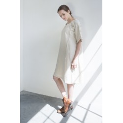 Stijl: Jurk met asymmetrische hals, geïnspireerd op Frans antiek nachthemd, gemaakt met Engelse en Franse naden.